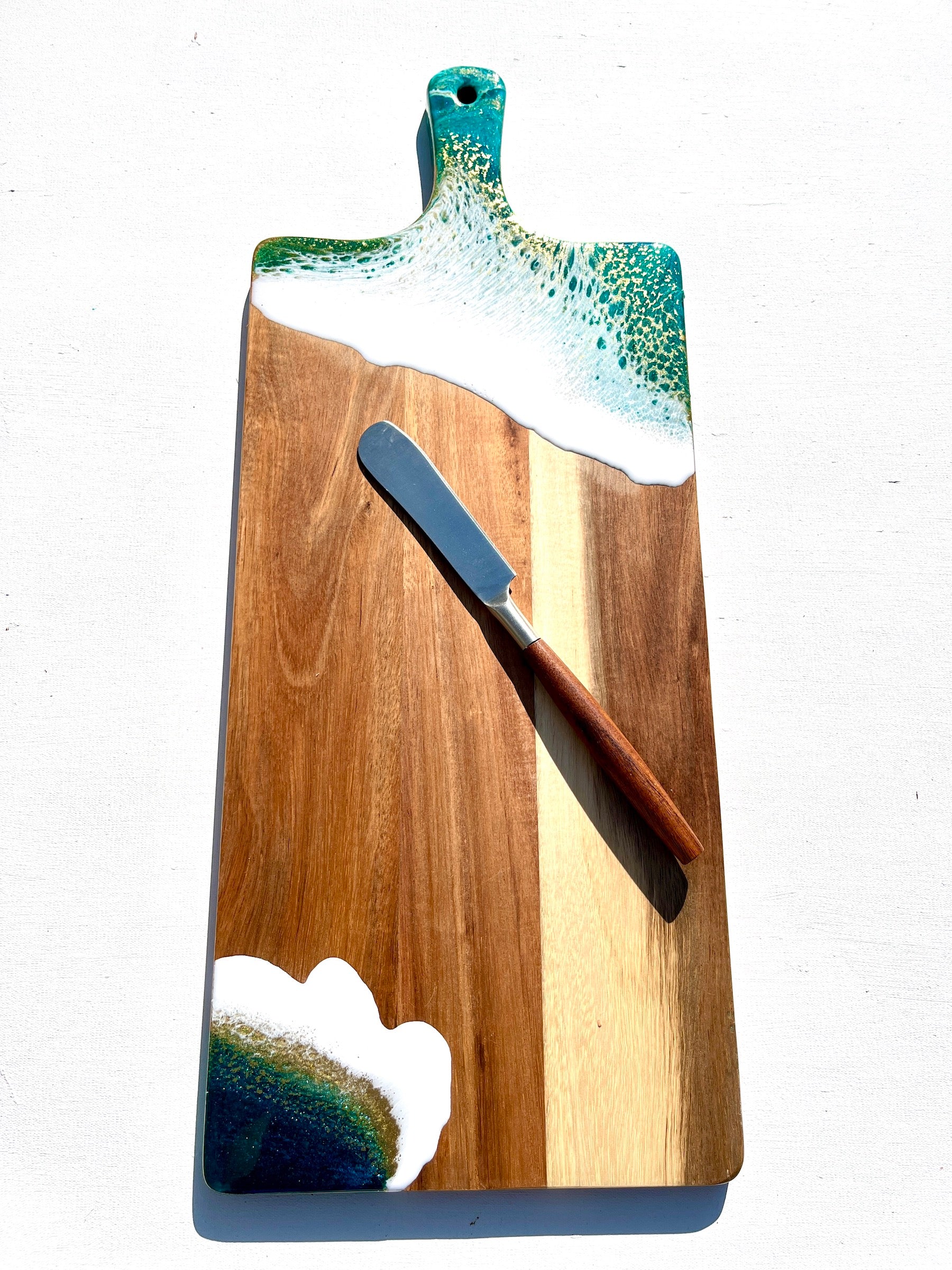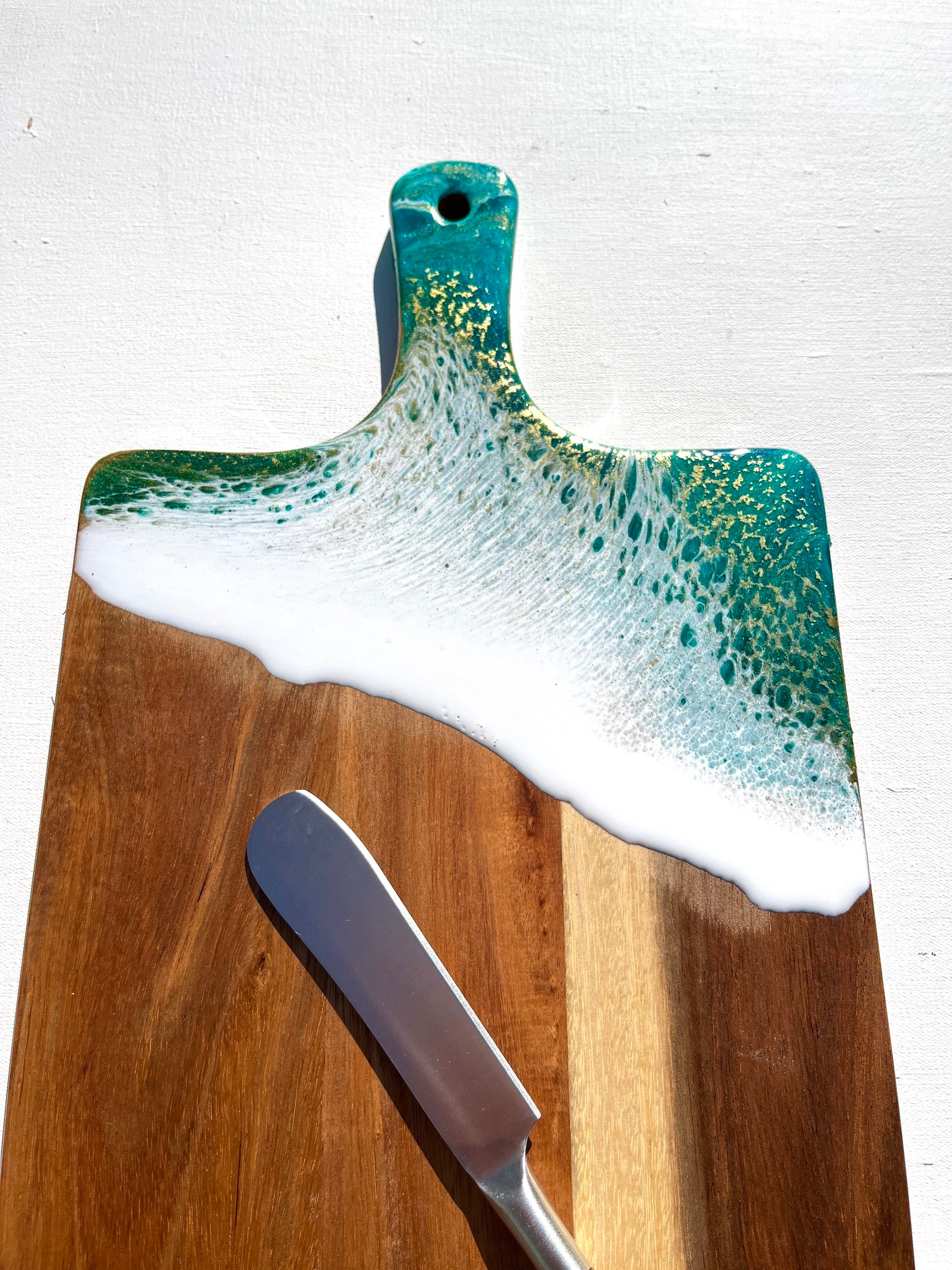 Painted with vibrant teal and white resin, and adorned with exquisite gold accents, this captivating piece is sure to mesmerise your guests. Complete with a cheese knife, this cheeseboard is not only visually striking but also practical. Indulge in the beauty and functionality of this gorgeous set, and create unforgettable moments around the table.