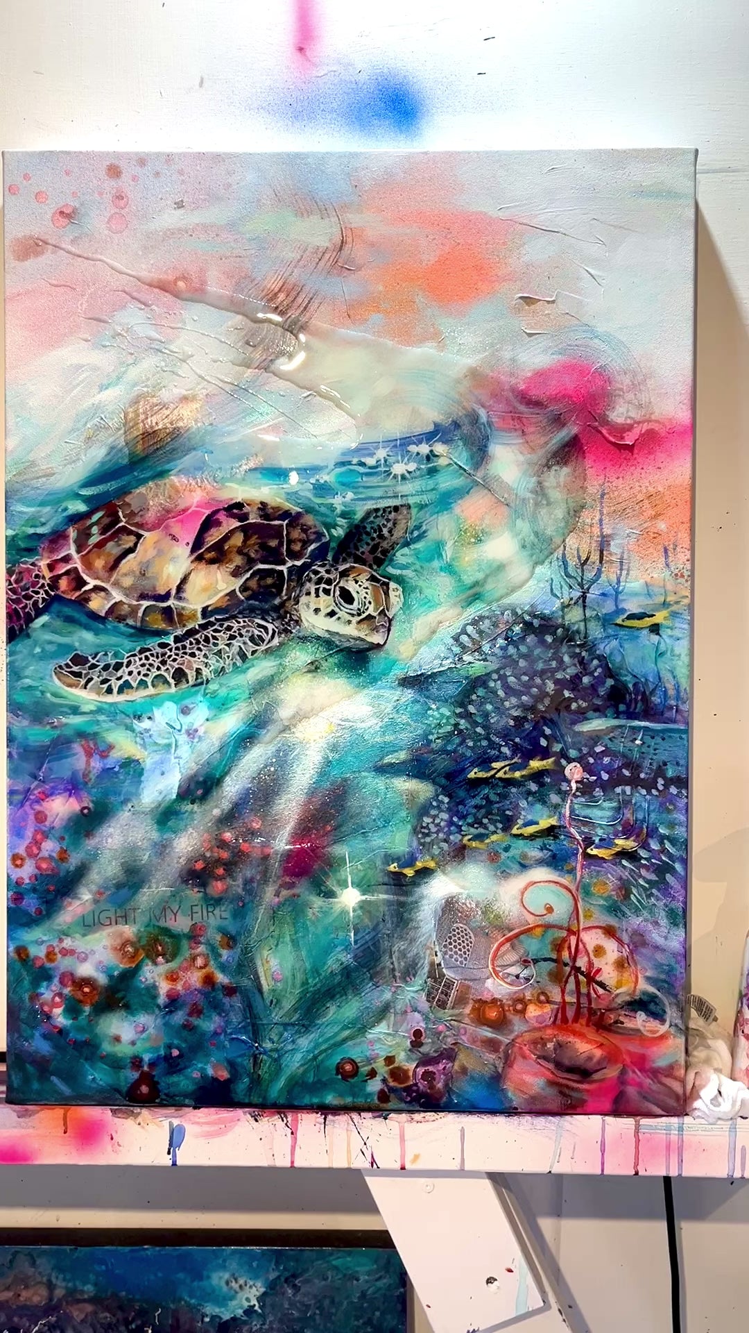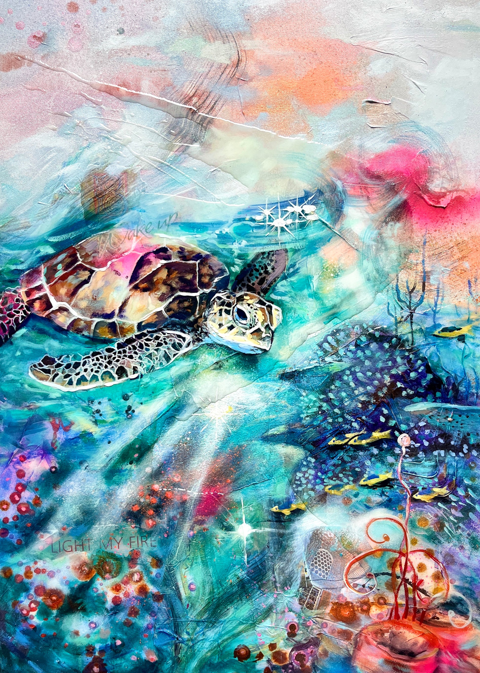 Teeming with vibrant sea creatures and intricate corals, the scene captivates the beauty and diversity of marine life. The centerpiece is a gracefully swimming turtle, gazing serenely at the underwater landscape from above. Meticulously painted with inks and acrylics, this artwork is finished with a splash of resin that weaves across the canvas, creating a mesmerizing illusion of water. The result is a stunning, high-quality creation that brings the wonders of the ocean into your space.Details