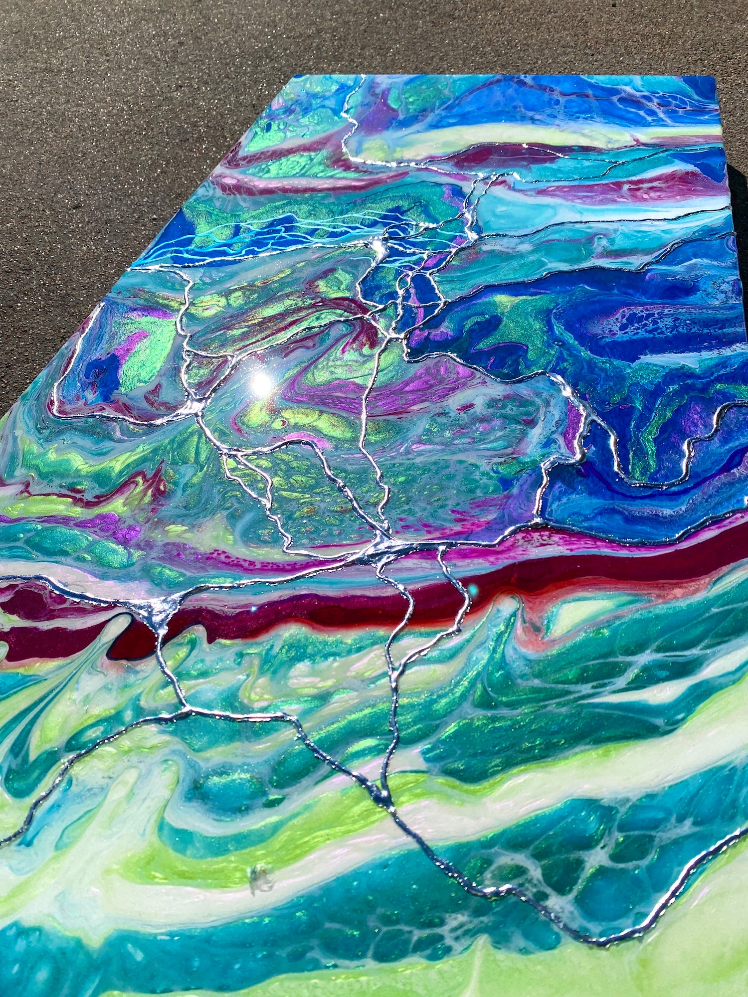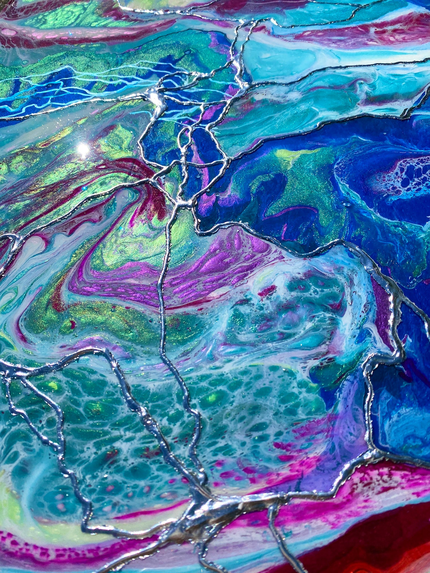 I must admit it took me a couple of tries to get the right combination of colours. The brief was also that needed to have silver 3 D lines with were made with silver leaf.