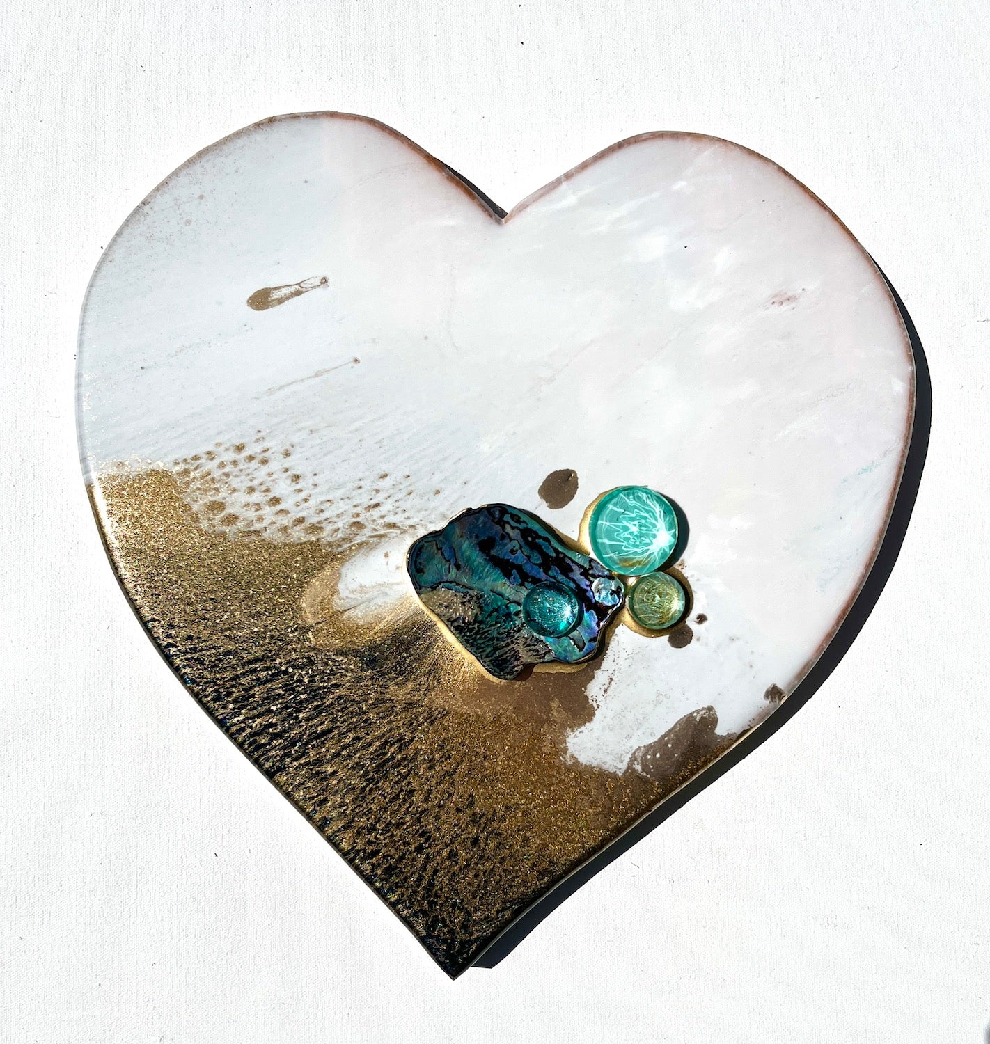 Painted with a limited colour palette of gold and white with stunning aqua acrylic crystals and genuine Paua shell.