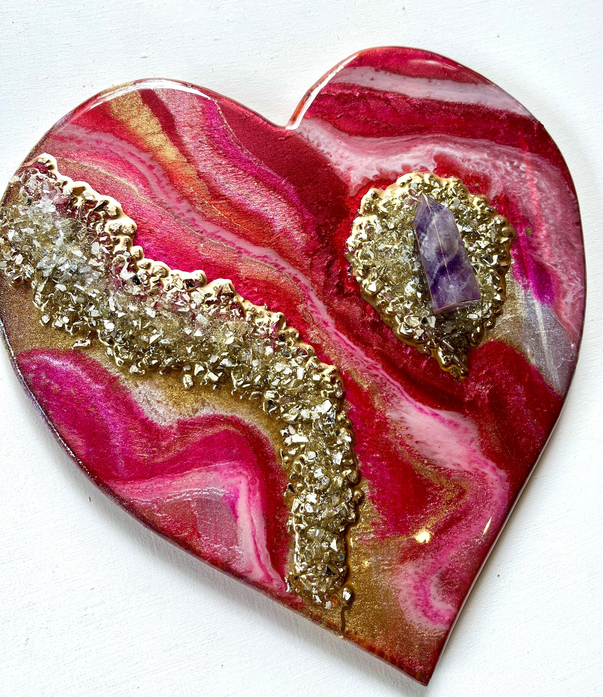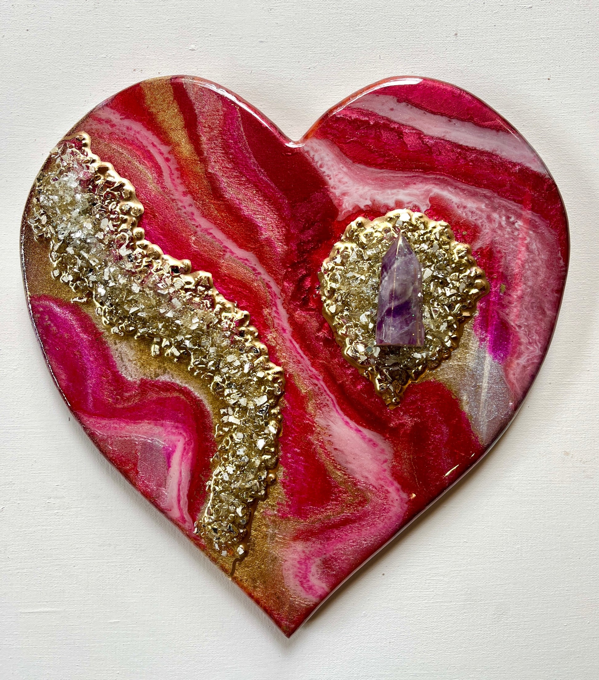 This gorgeous love heart is painted in shades of pink and red, with shimmering lashes of gold and iridiscent white. Features a river of glass painted in gold and a heart centre with a natural fantasy Amethyst point.