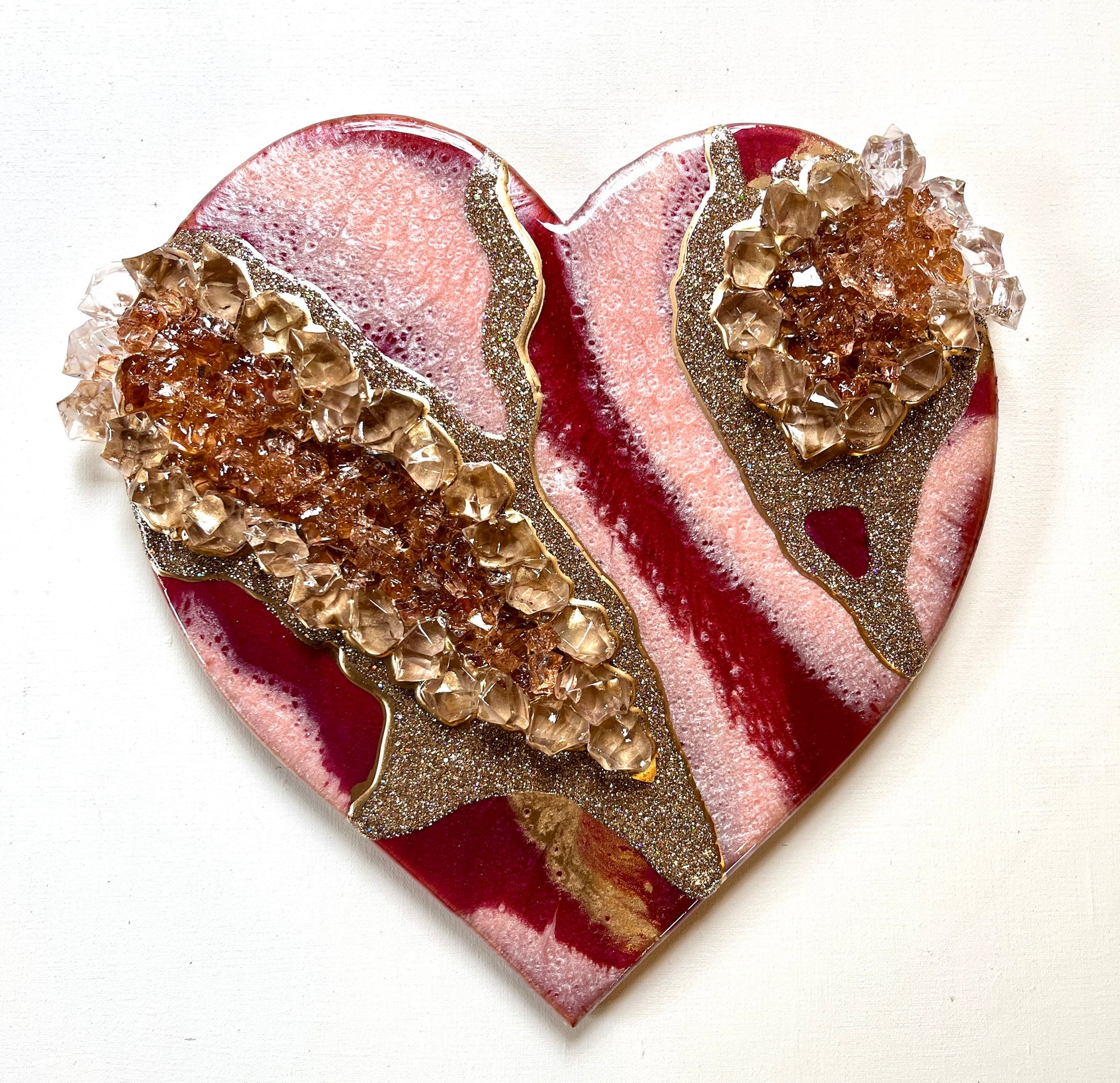 Painted in shades of light shimmering pink and deep rose, with details of acrylic crystals and pink, surrounded by highly glittery lines.