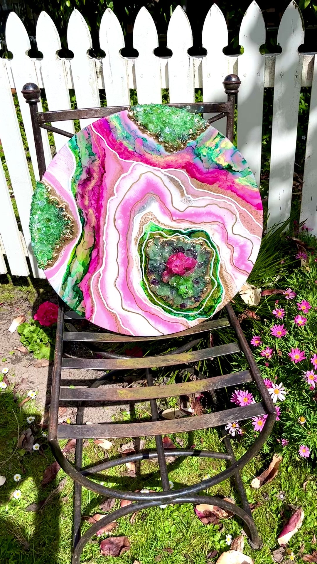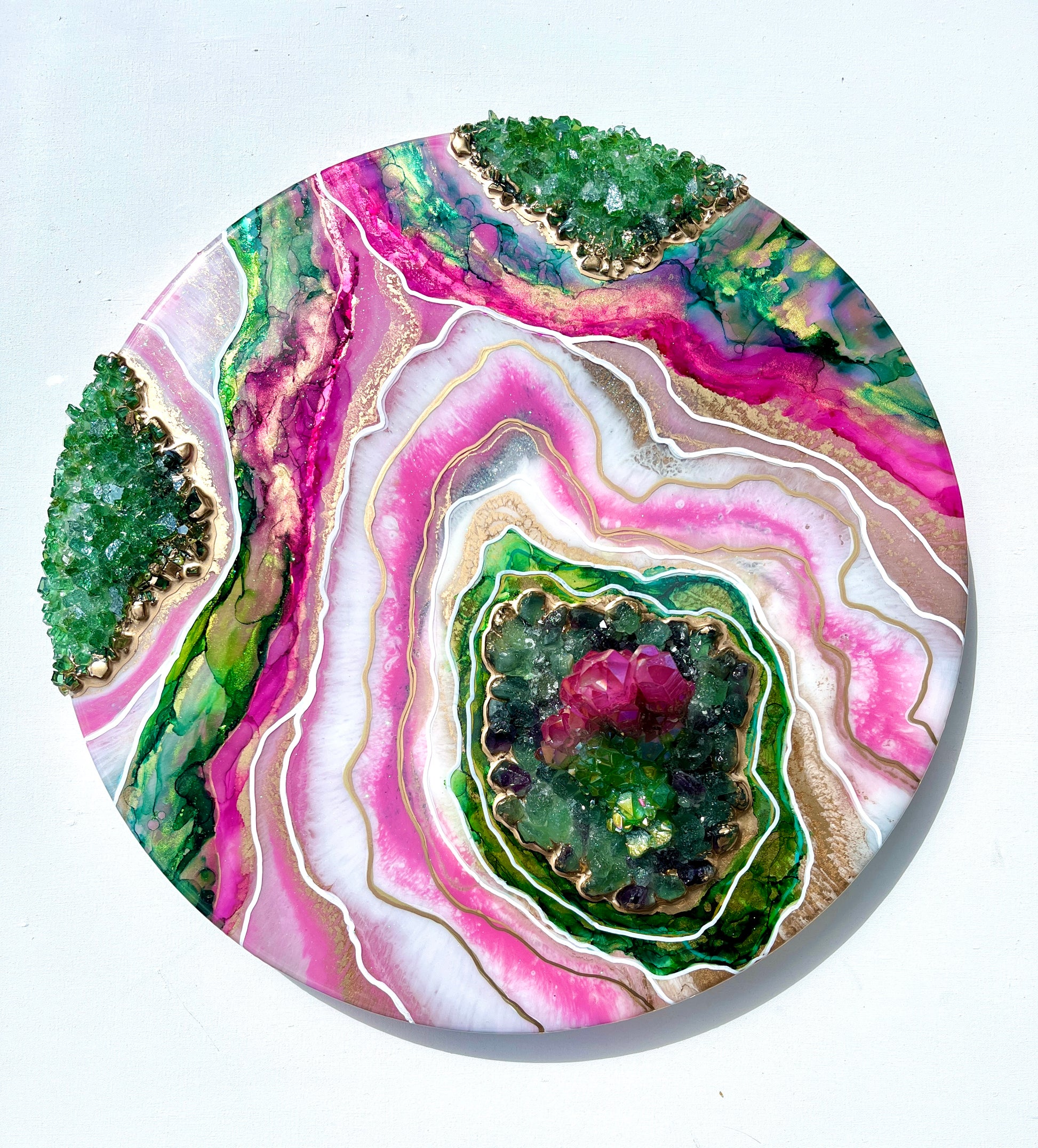 At the heart of this artwork lies a core embellished with green glass and gemstones, serving as a bejewelled testament to nature's magnificence. Drawing the eye further inward, a centrepiece of pink and green angel aura quartz cluster carrying the magic of universal love into your home.