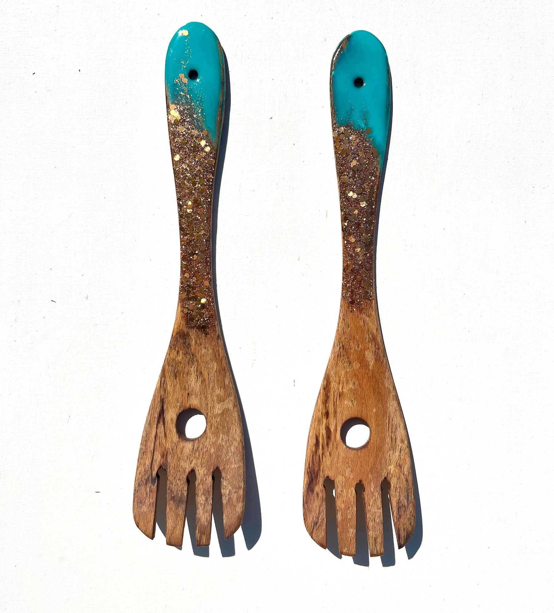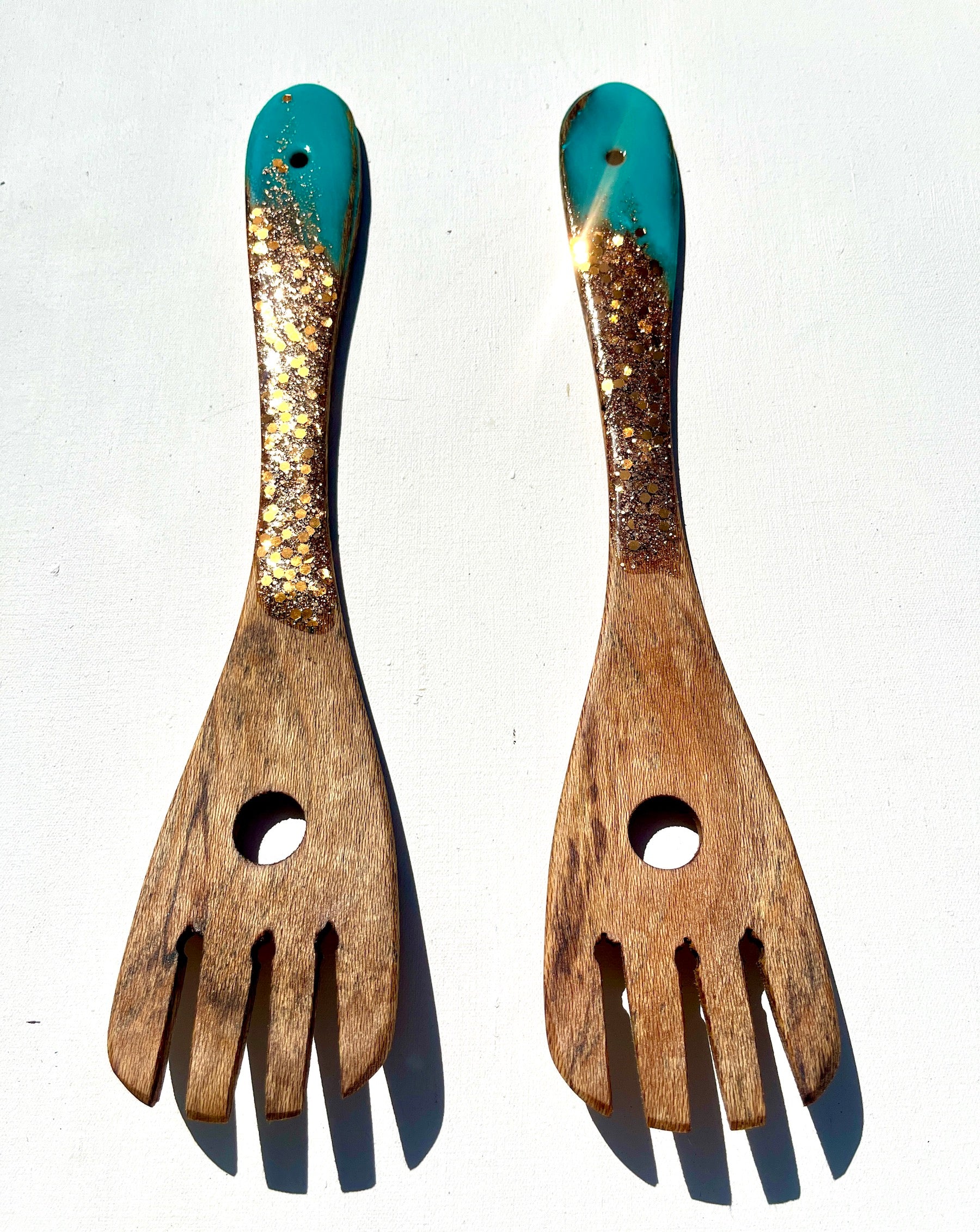 Experience the epitome of elegance with this spoons made from recycled Rewa Rewa wood, showcasing a captivating blend of teal and luxurious glitter gold.