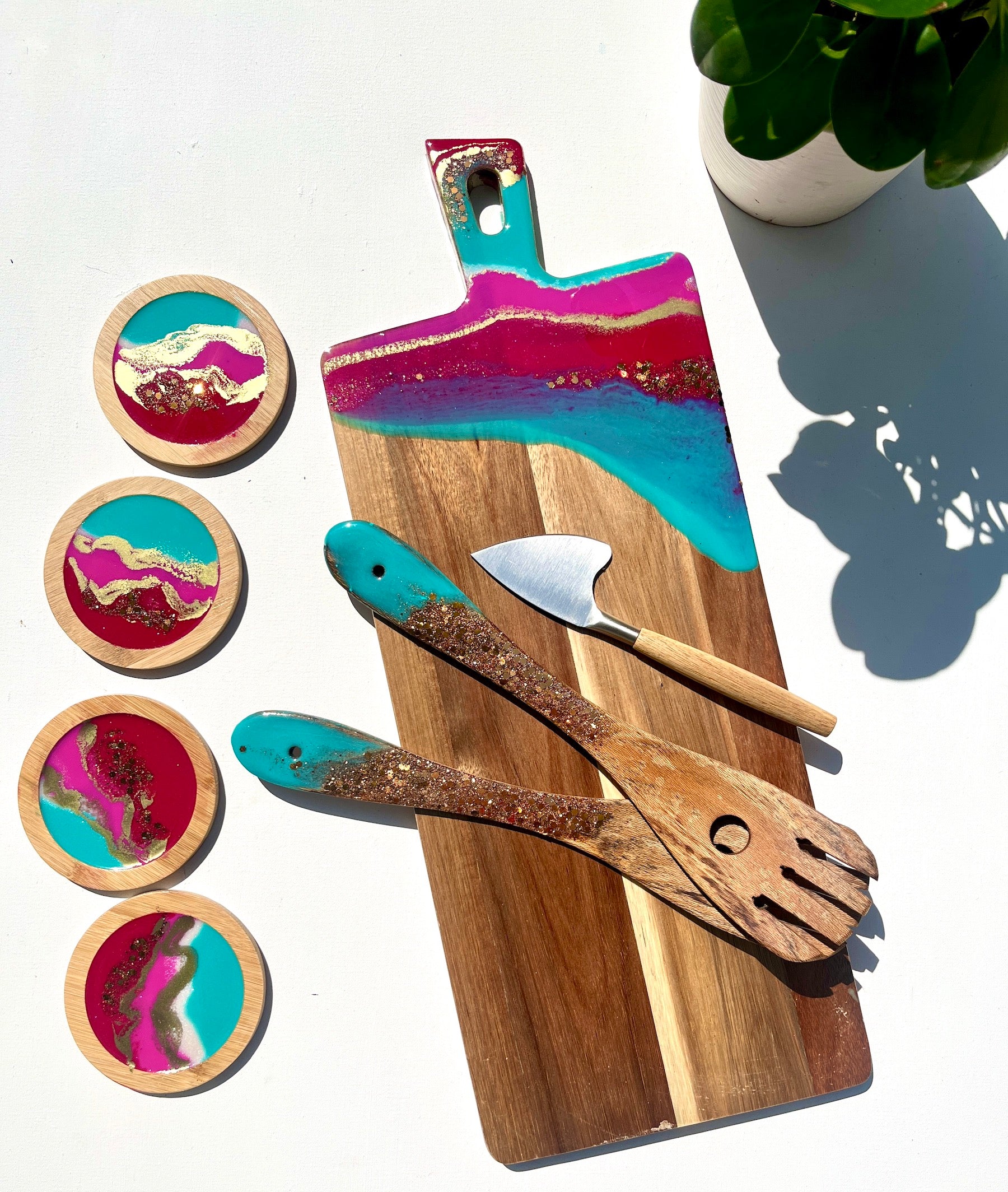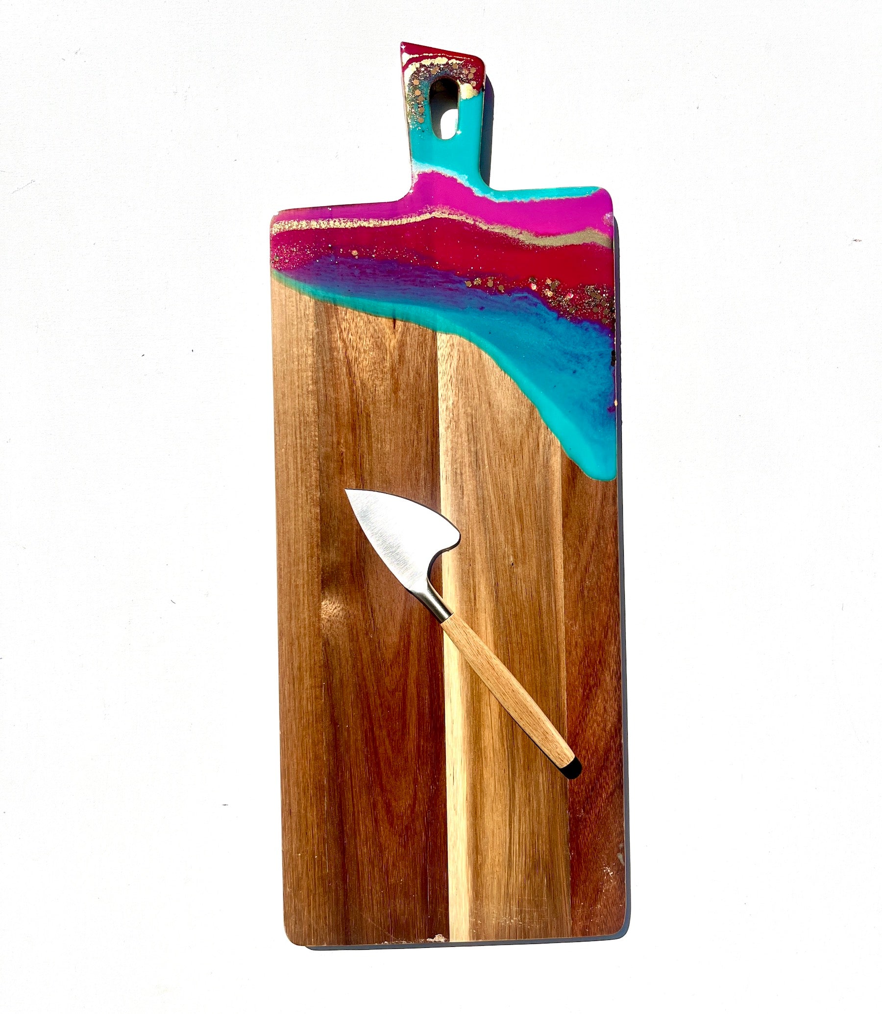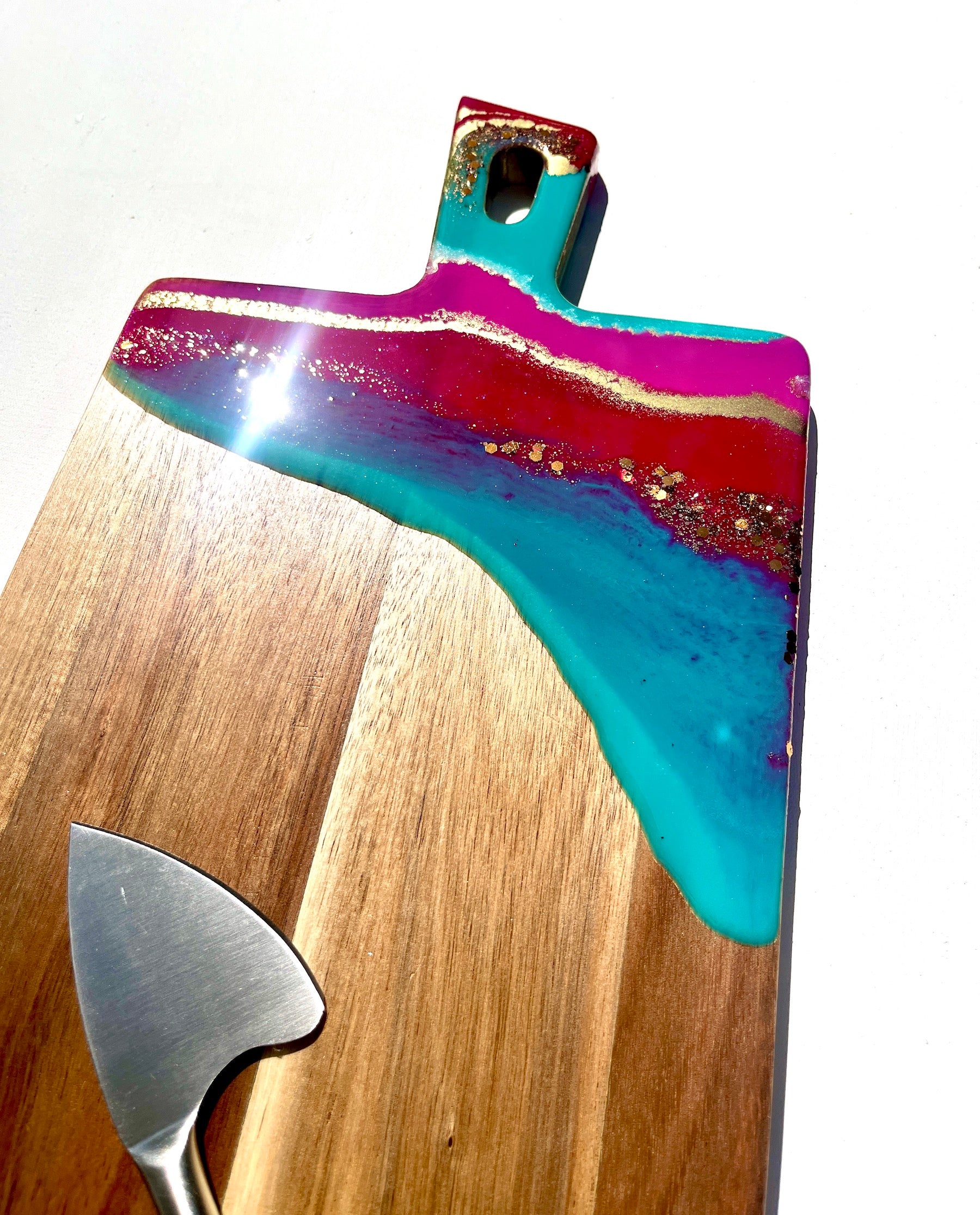 The wooden base of this cheeseboard provides a warm and inviting backdrop, while the vibrant shades of teal, hot pink, and red, painted with resin, add a burst of colour and personality. To elevate its allure, lashings of gold and gold glitter are delicately applied, creating a touch of glamour that is sure to impress your guests..