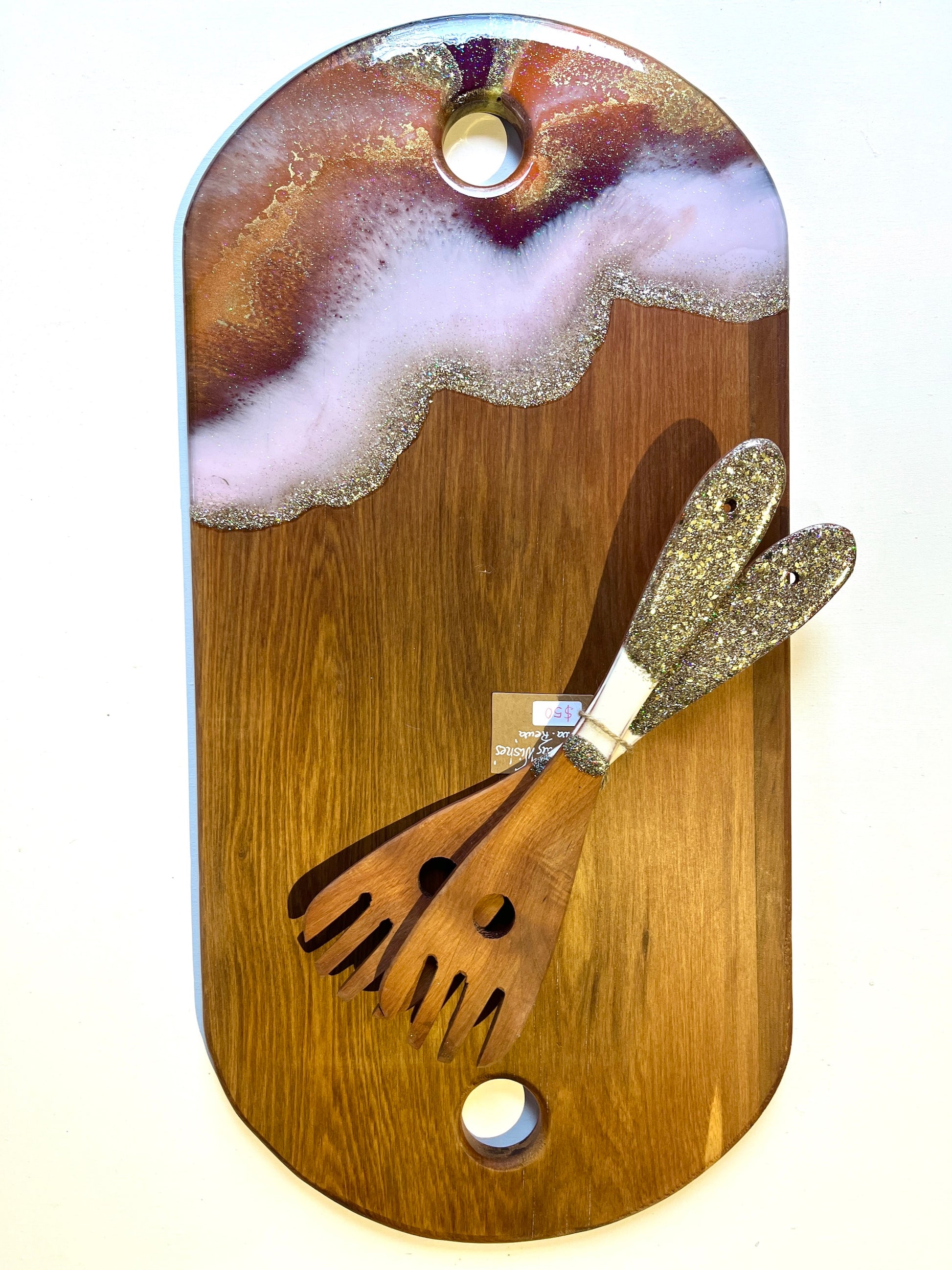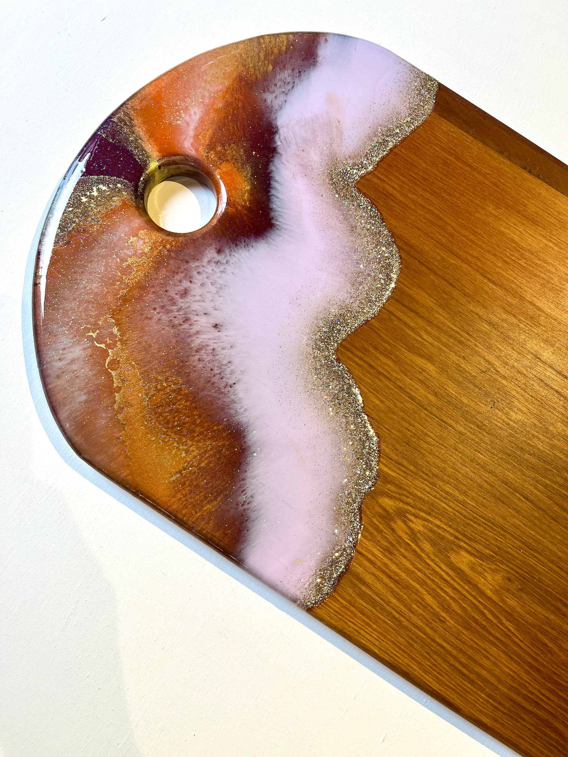 Painted in soft, pastel colours, this handmade rimu cheeseboard is one of a kind.Finished with a gorgeous band of glittering gold that blends into the soft lilac.