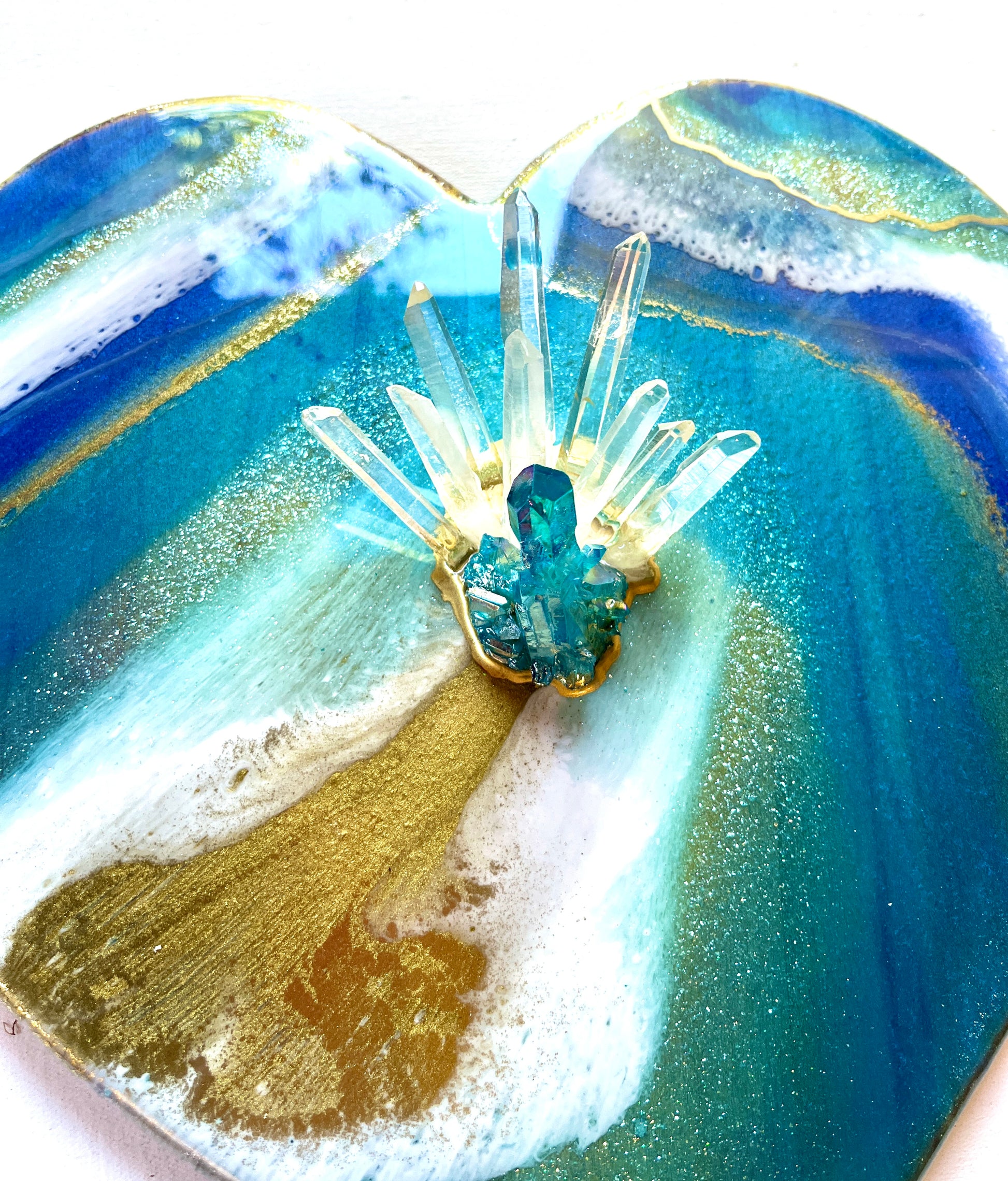 This love heart reminds me of fireworks in the sky. At its centre, a rosette of crystal quartz points surrounding a blue aura quartz cluster.