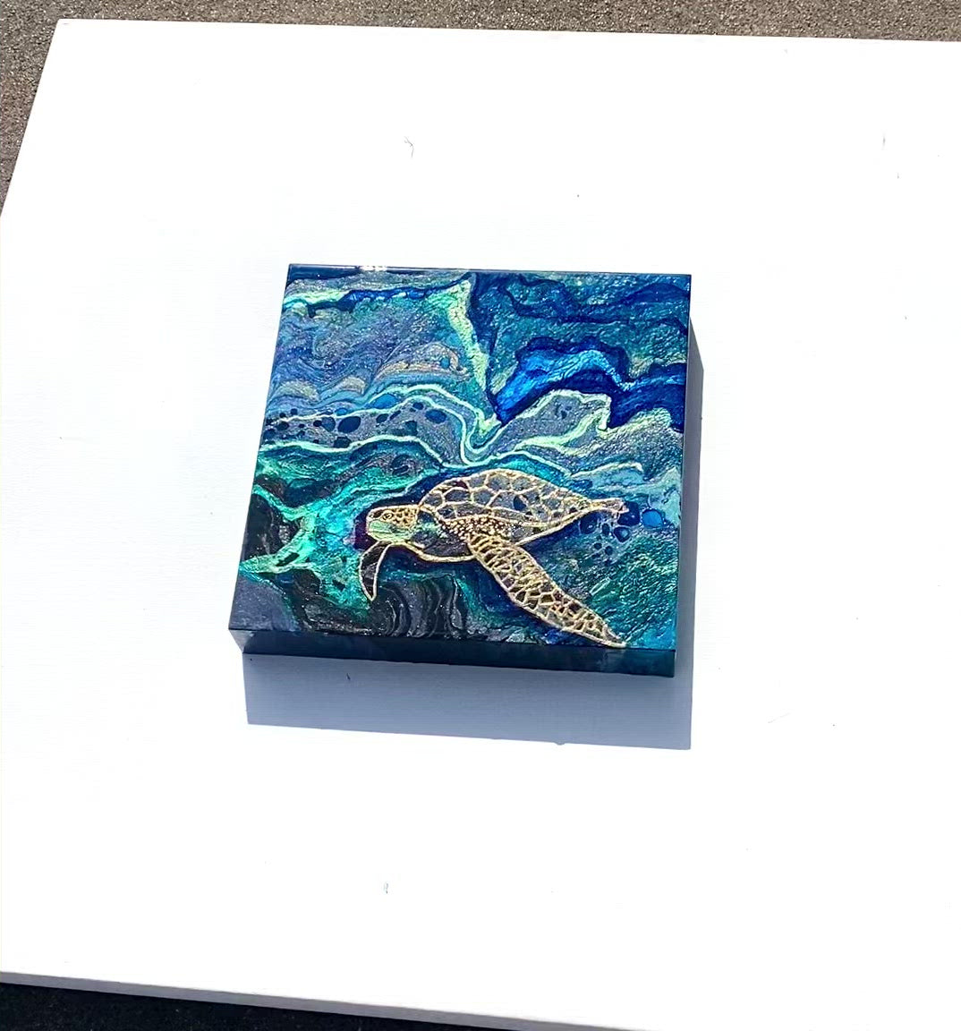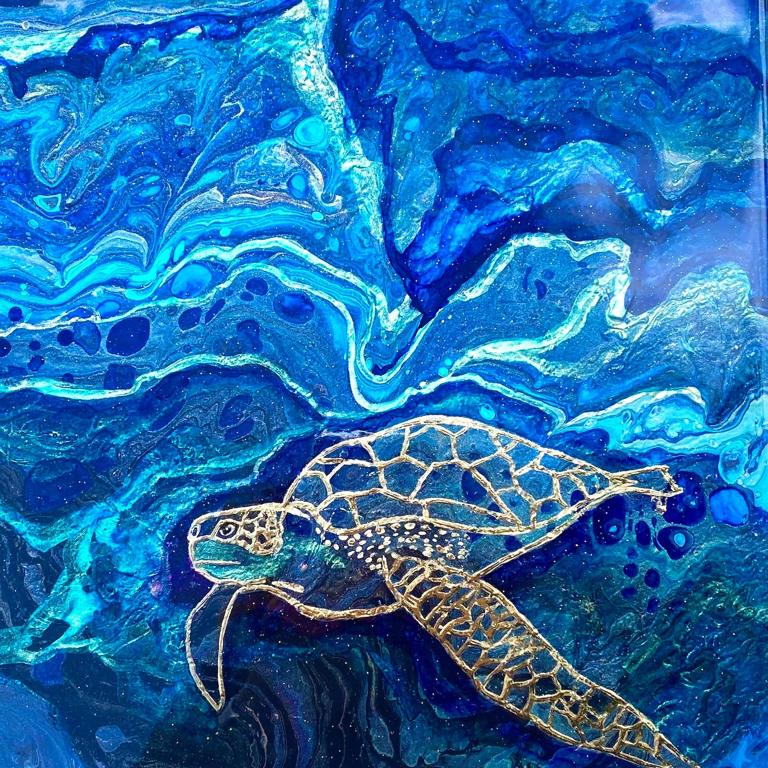 Painted in hues of teal, shimmery green and blues with the turtle taking the centre stage in gold leaf. This painting has an unreal amount of sparkle!