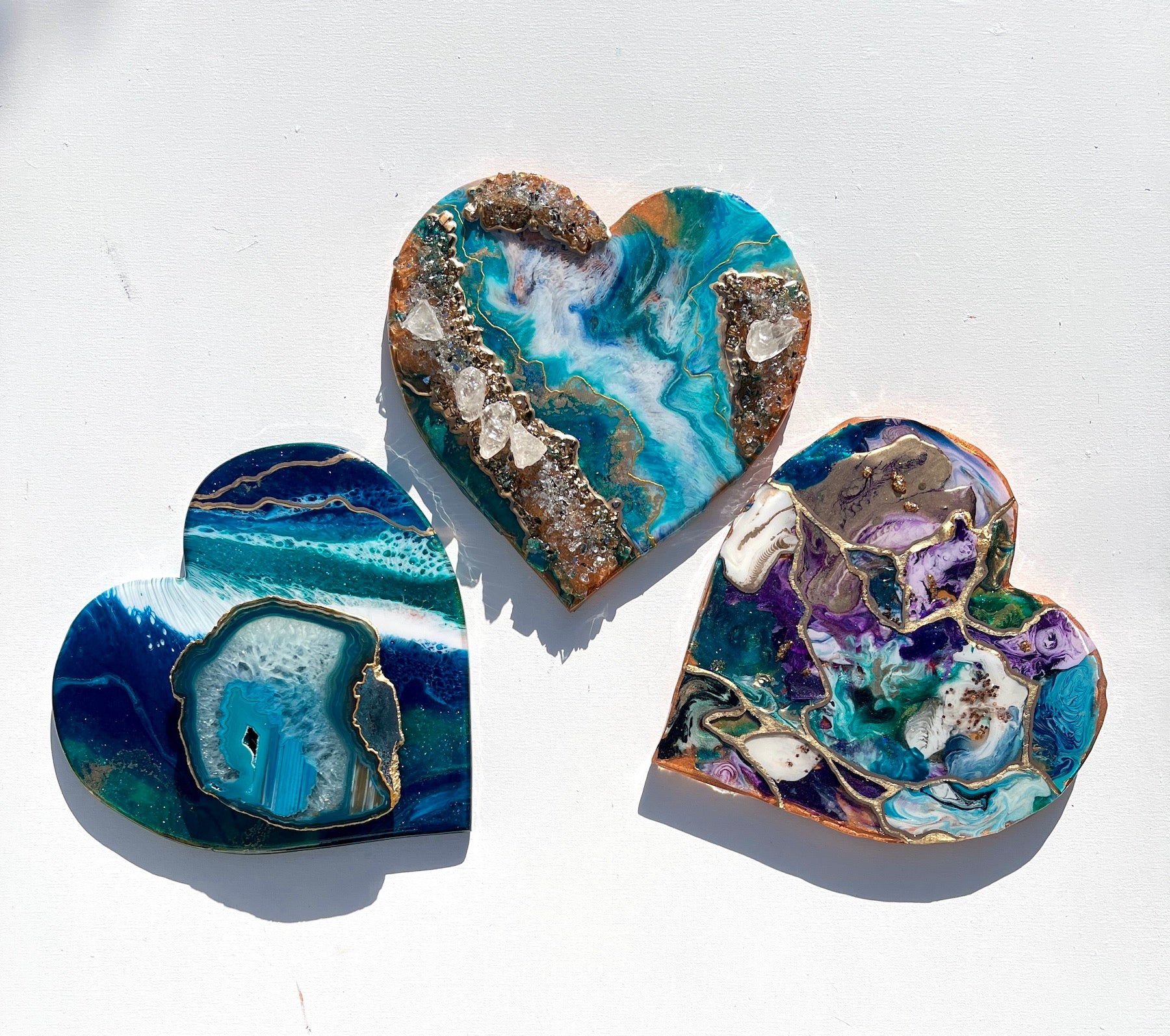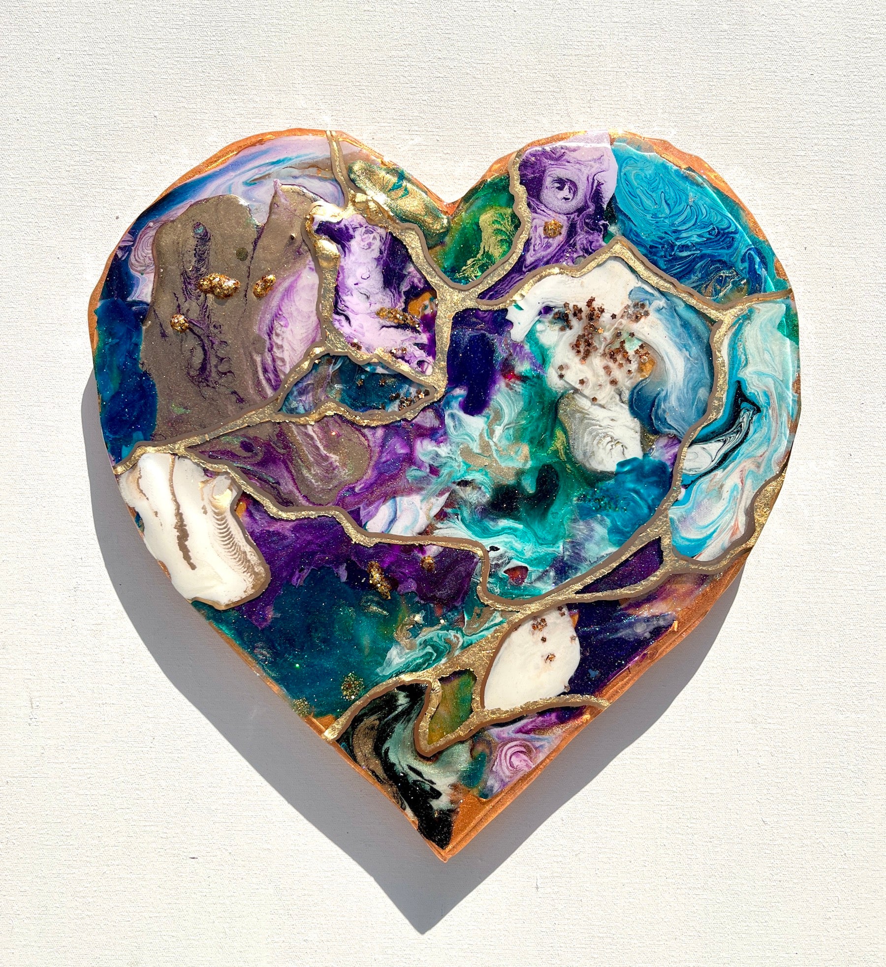 This artwork is created using recycled pieces of resin in a stunning array of blues, teals and purples. Each fragment is thoughtfully united by delicate gold leaf lines, reminiscent of the intricate artistry found in Japanese pottery. Just as Kintsugi celebrates the cracks and imperfections in pottery by highlighting them with gold, our Love Heart Shaped Artwork embraces the uniqueness of each resin piece, creating a harmonious composition that tells a story of resilience and beauty.