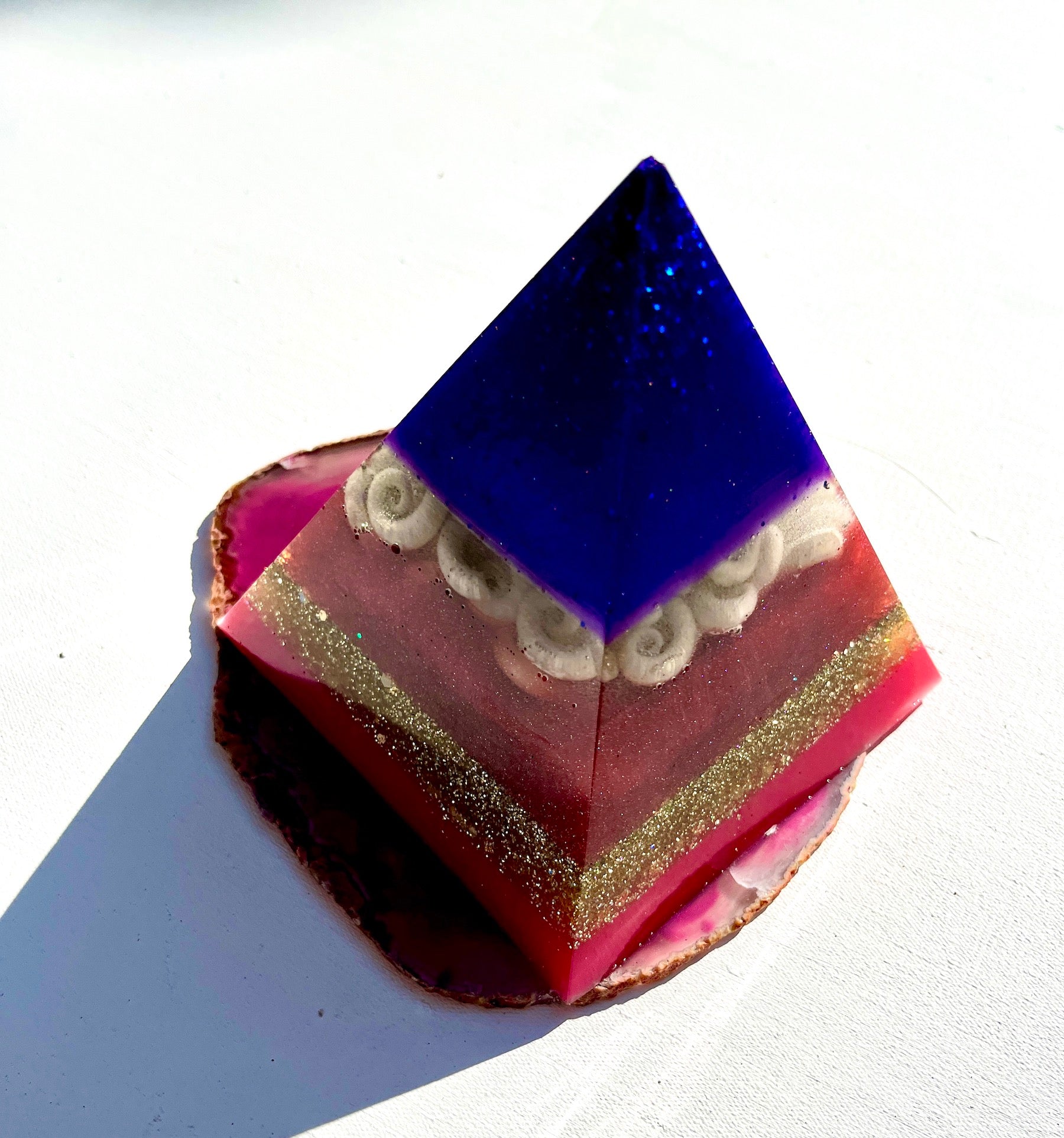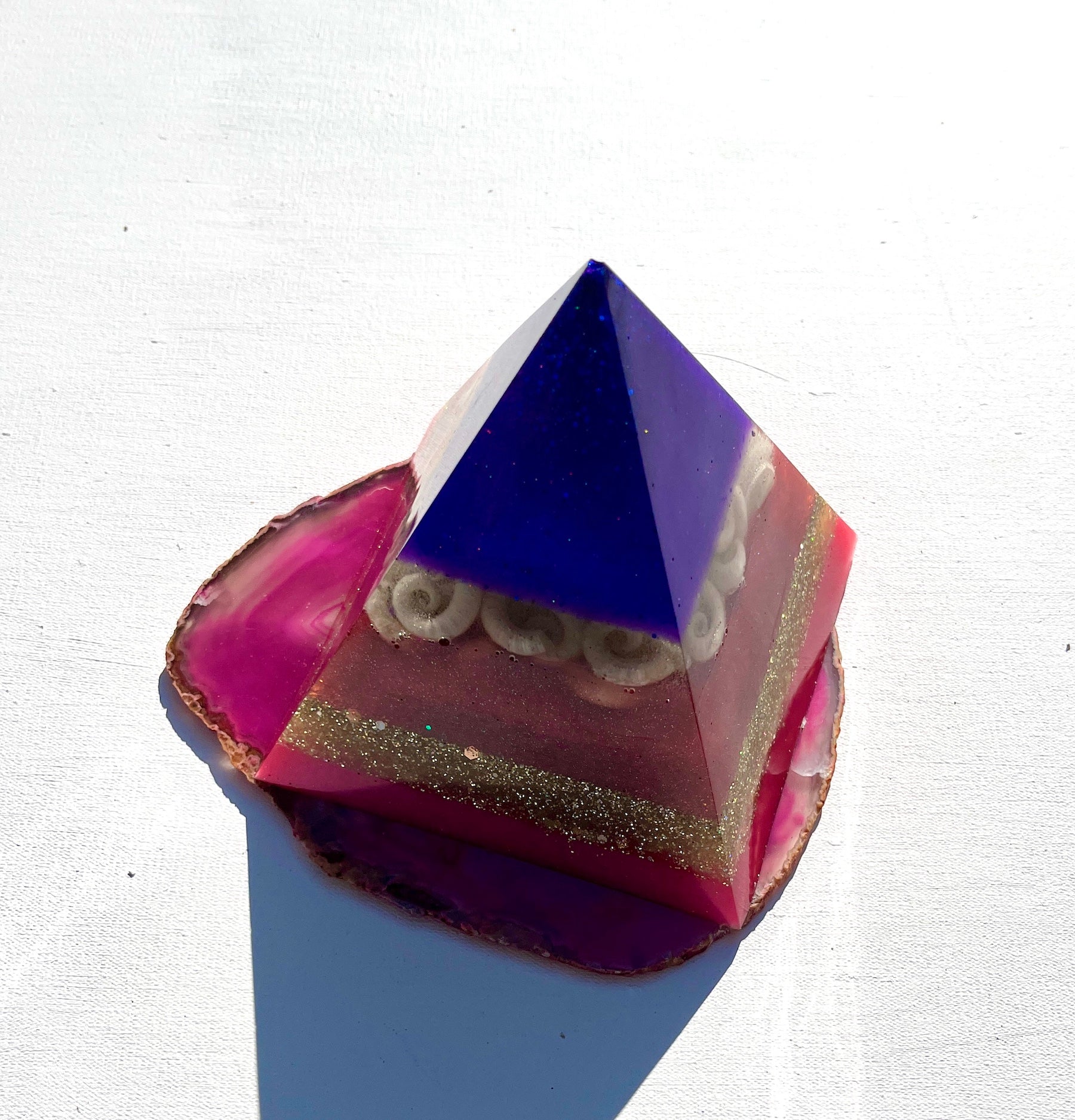 Adorned with a stunning array of glittery colours and shells, this pyramid sits gracefully on a pink agate slice. Its vibrant hues add a touch of vibrancy and joy to any setting. Whether used as a paperweight or a simple ornament, it effortlessly enhances the ambiance of your home.
