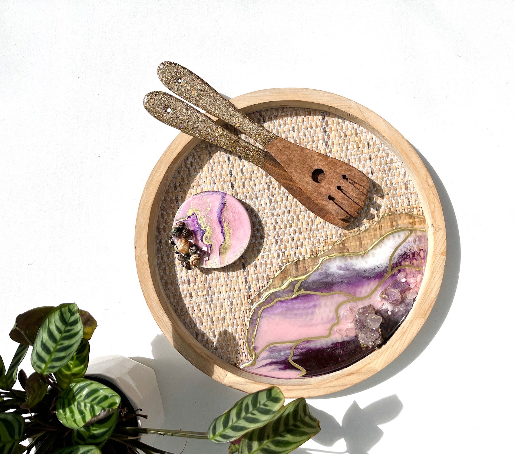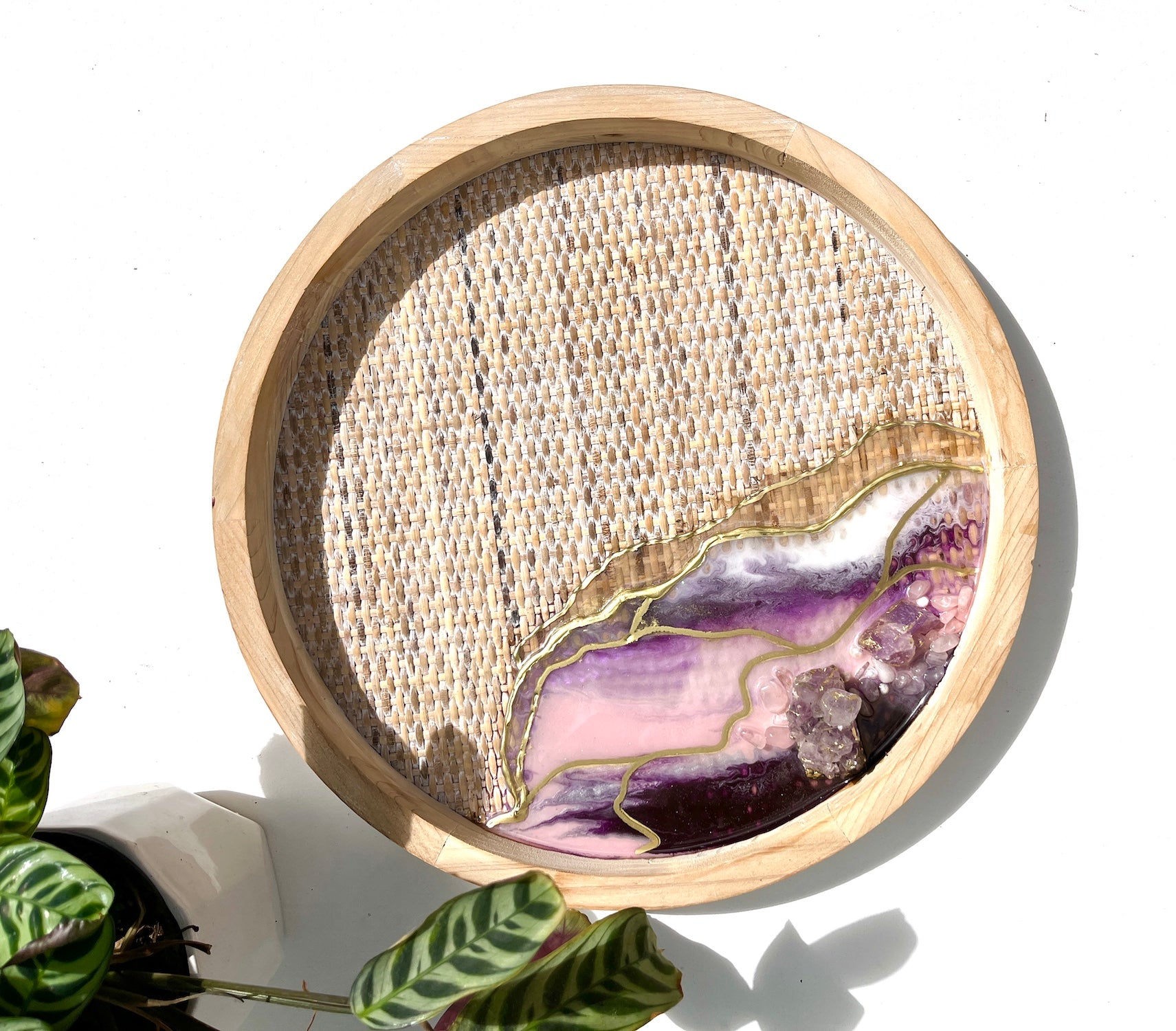this lovely tray is painted in shades of dusky pink and purple with white lacy waves and gold lines streaming across.