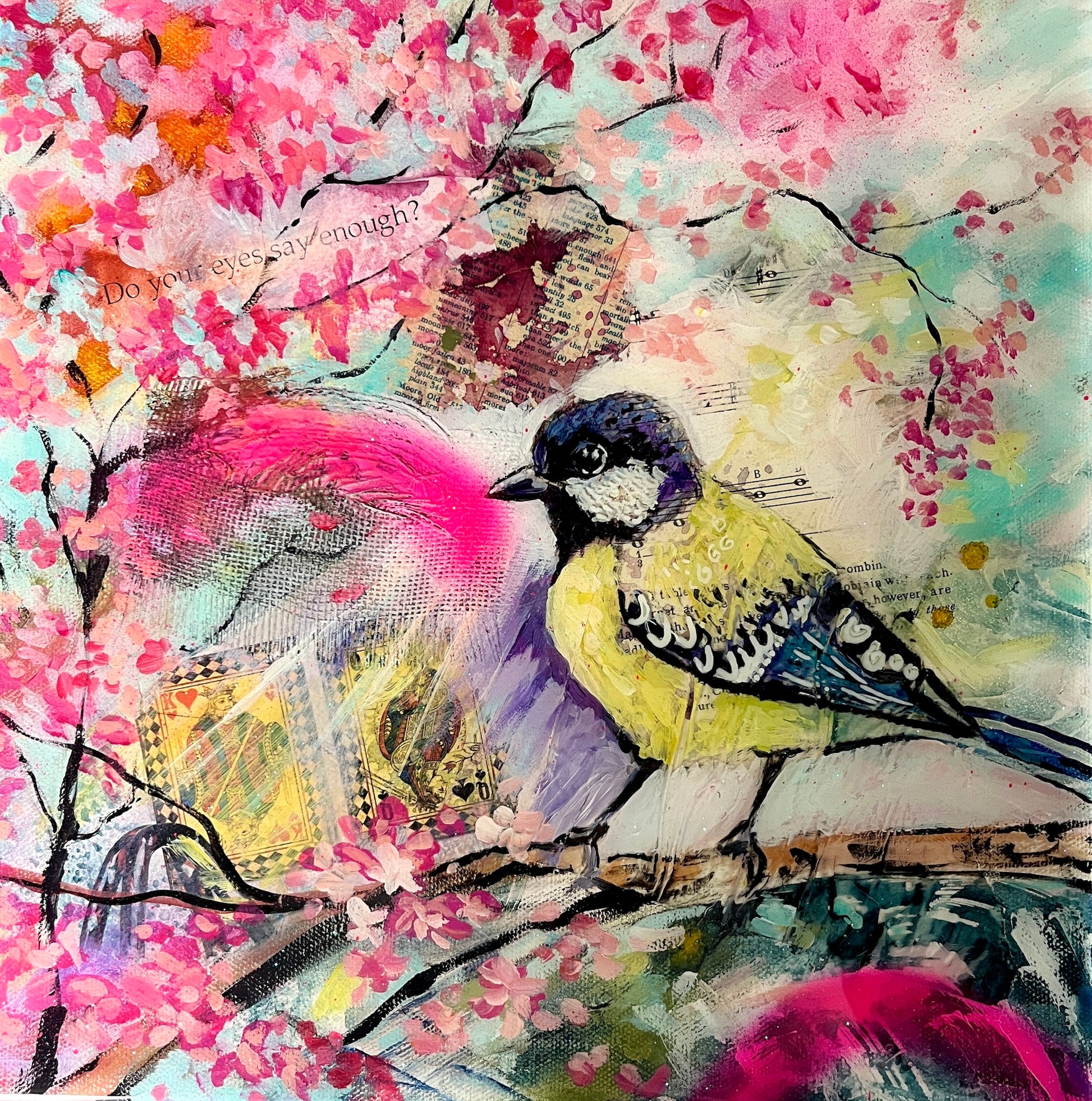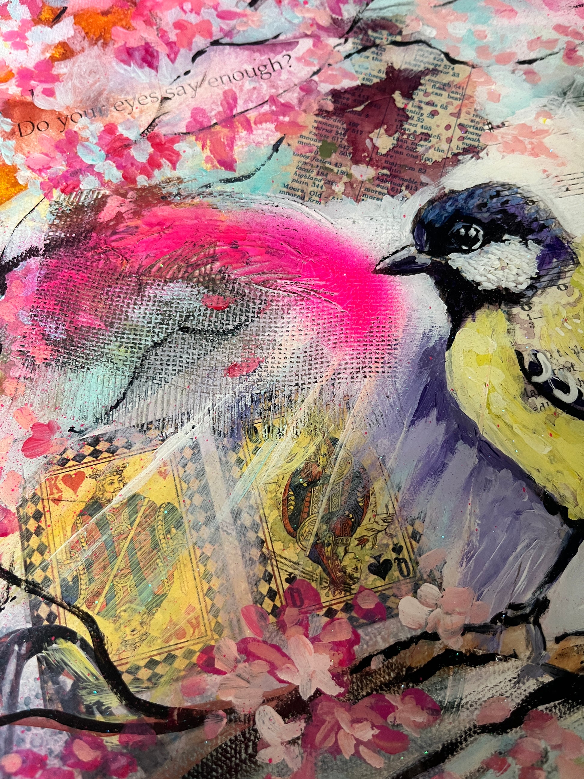 At the centre of the painting, a lonely bird sits on a branch, gazing intently at a collaged picture of King and Queen cards, a subtle yet powerful symbol of love and desire.