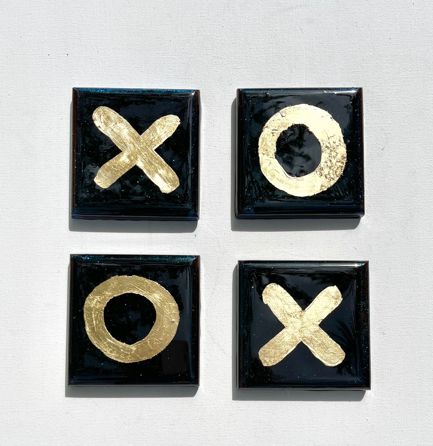 Perfect for a gift or a treat for yourself. This unique set of 4 casters features gold leaf over a shimmering black background.